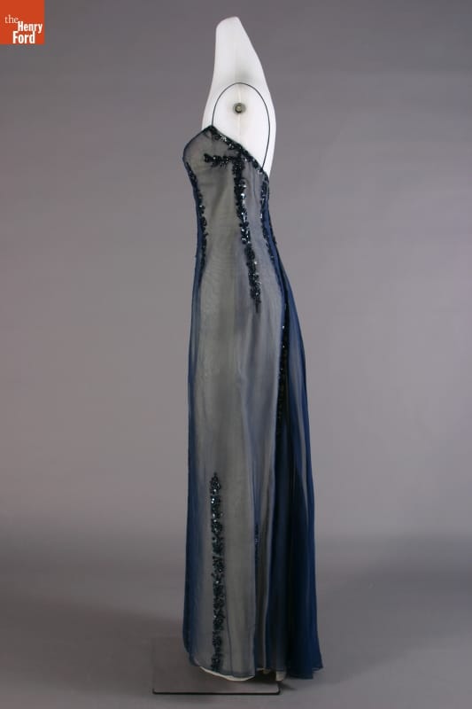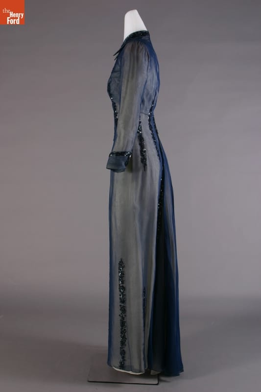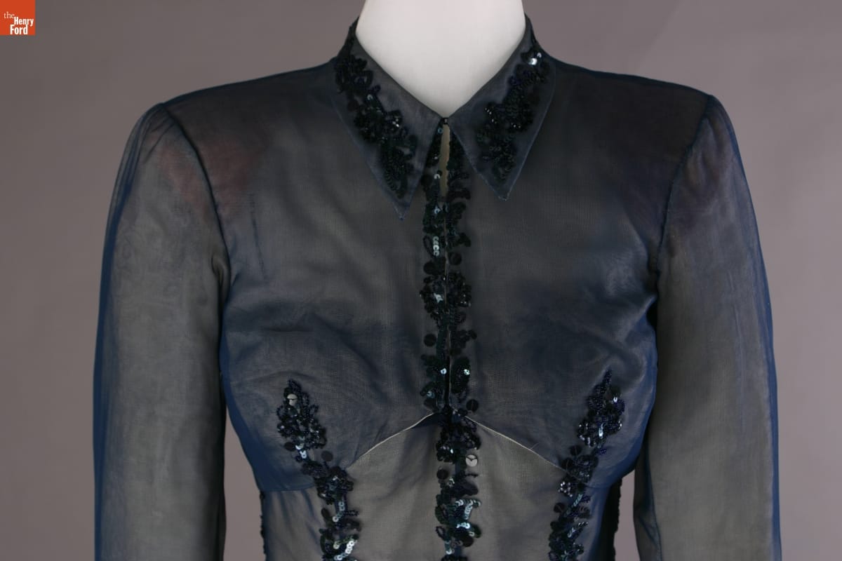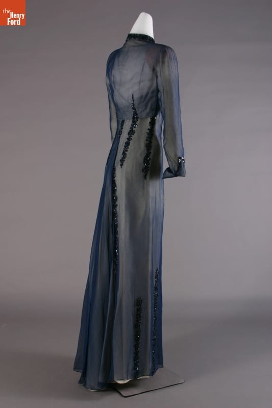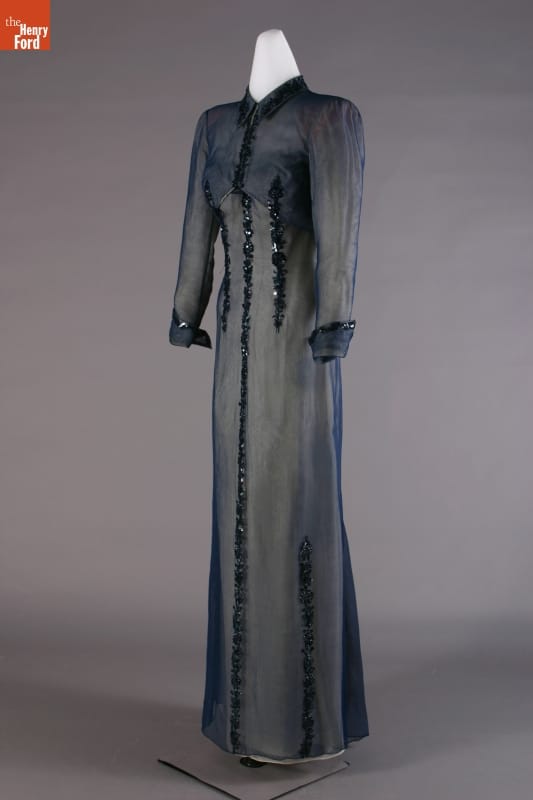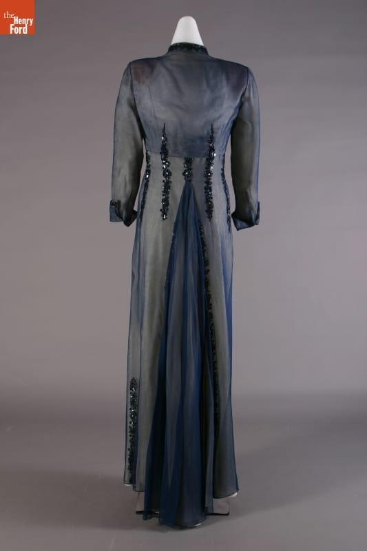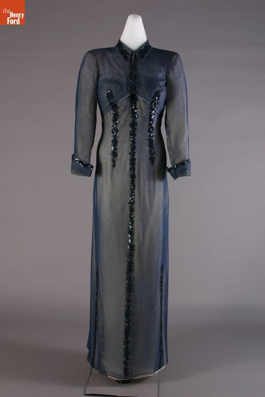 Elizabeth Parke Firestone, wife of tire magnate Harvey S. Firestone, Jr., cultivated a refined sense of fashion. Her fashion choices not only reflected her years of interest in clothing design and collaboration with world-renowned couturiers, but also highlighted her family's social standing. Firestone wore this jacketed dress -- by American designer Carrie Munn -- to her 25th wedding anniversary celebration at New York's Ritz Hotel.