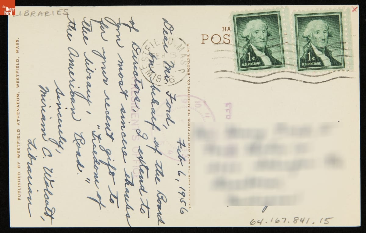 Postcard, "The Athenaeum, Westfield, Massachusetts," 1951-1956