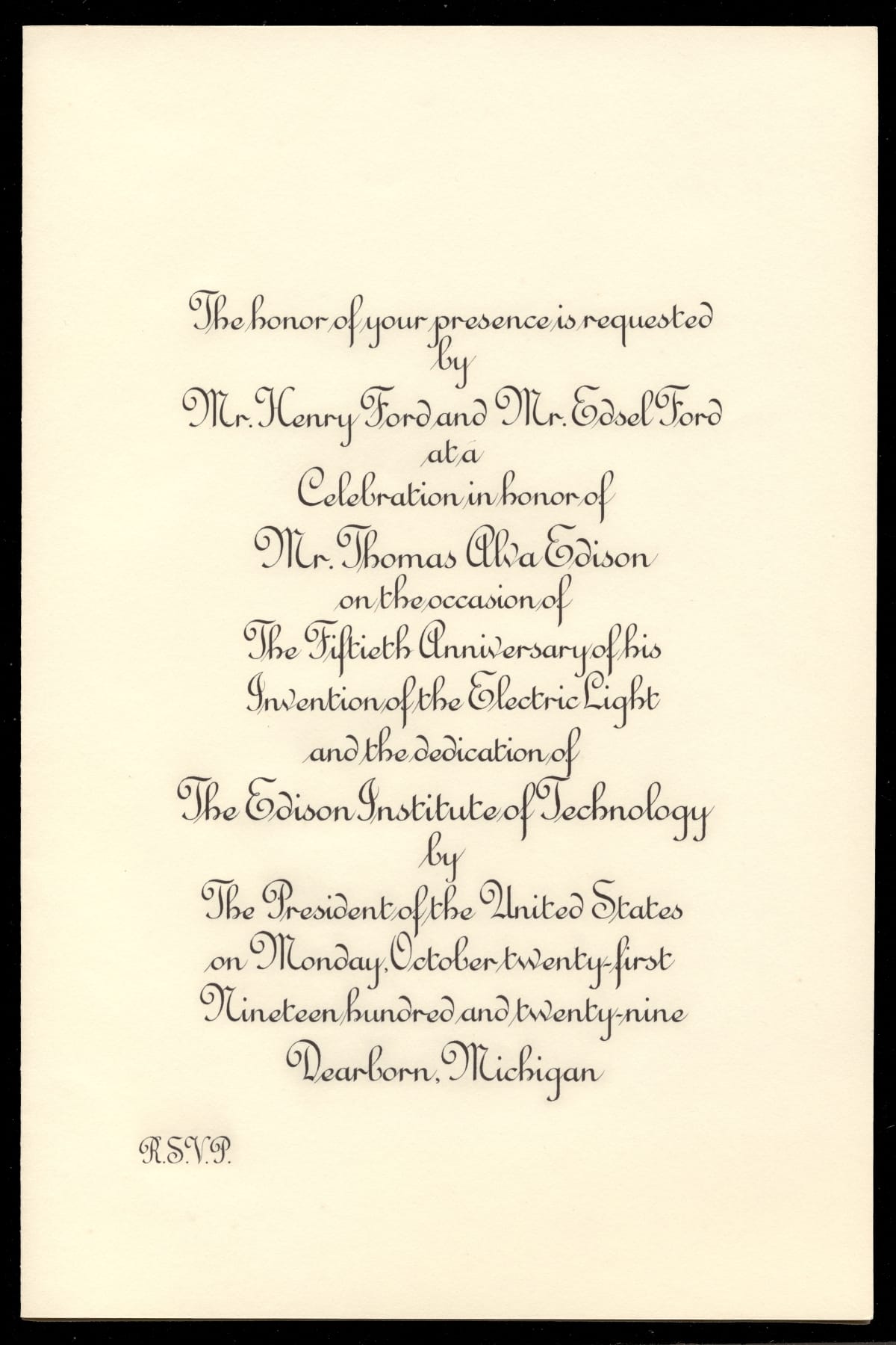 Invitation to Light's Golden Jubilee Celebration and Edison Institute Dedication, Dearborn, Michigan, 1929