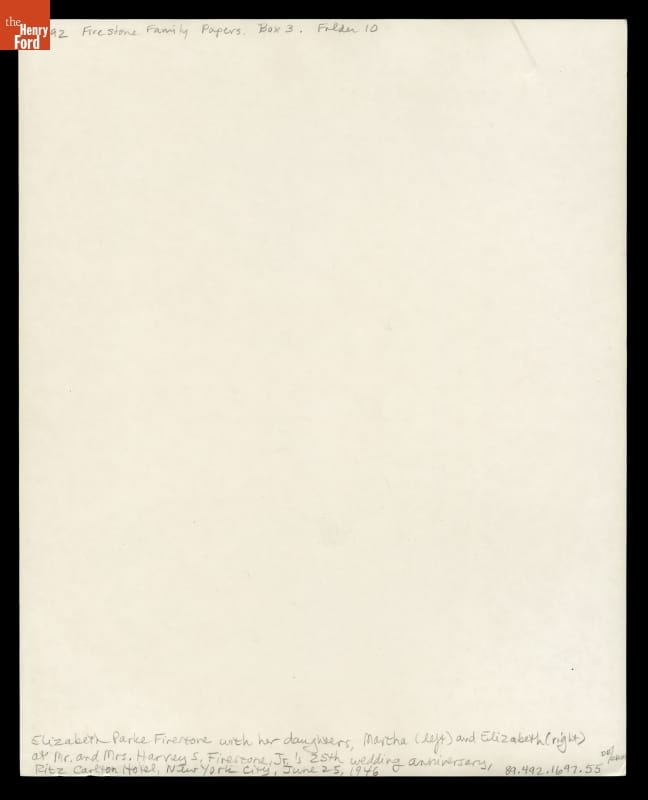 Elizabeth Parke Firestone at Her 25th Wedding Anniversary Celebration with Daughters Martha and Elizabeth, June 25, 1946