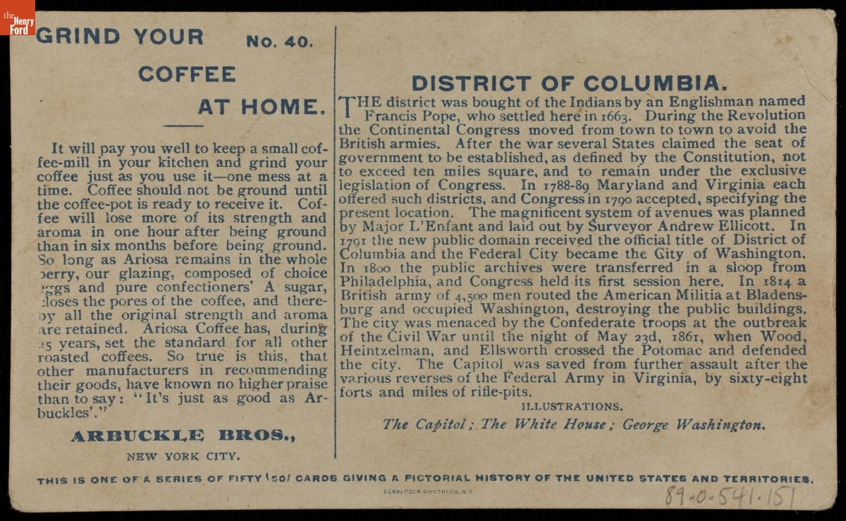 Trade Card for Ariosa Coffee, Arbuckle Bros., "District of Columbia," 1883