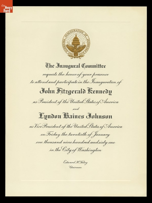 The Inaugural Committee requests the honor of your presence to attend and participate in the Inauguration of John Fitzgerald Kennedy as President of the United States of America and Lyndon Baines Johnson as Vice President of the United States of America on Friday the twentieth of January one thousand nine hundred and sixty-one in the City of Washington Edward H. Foley Chairman