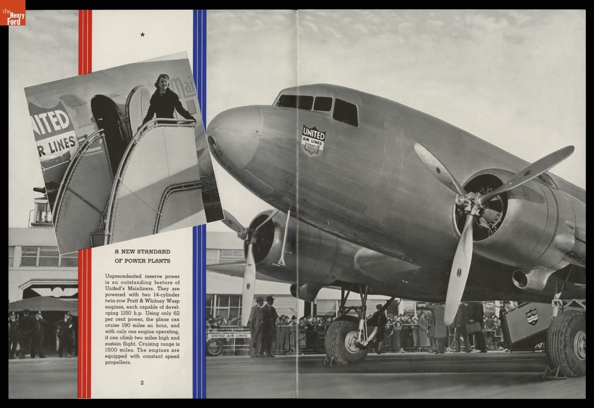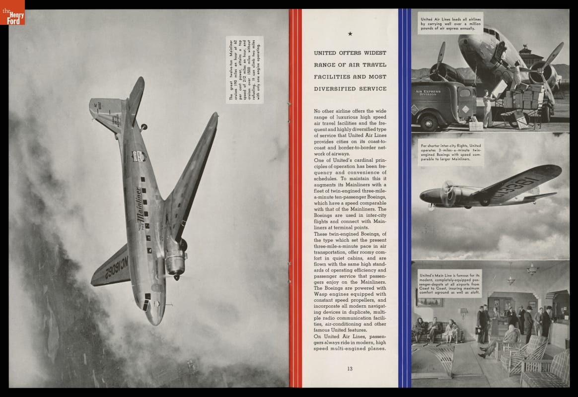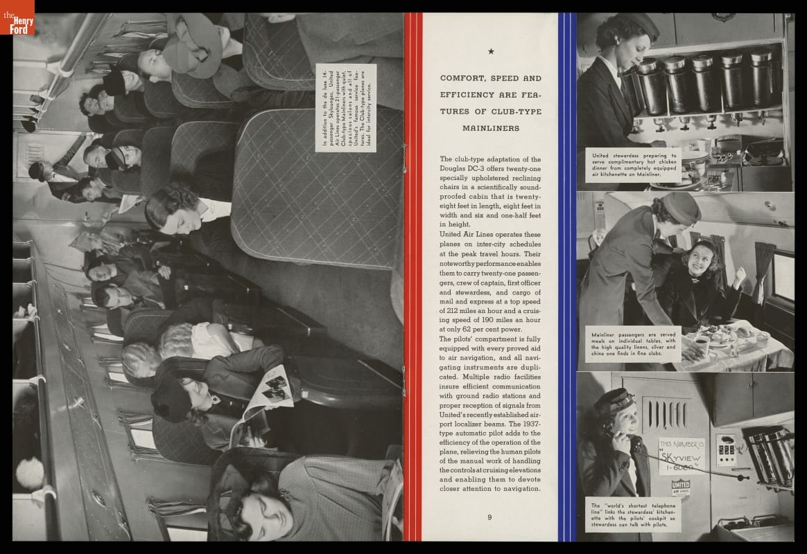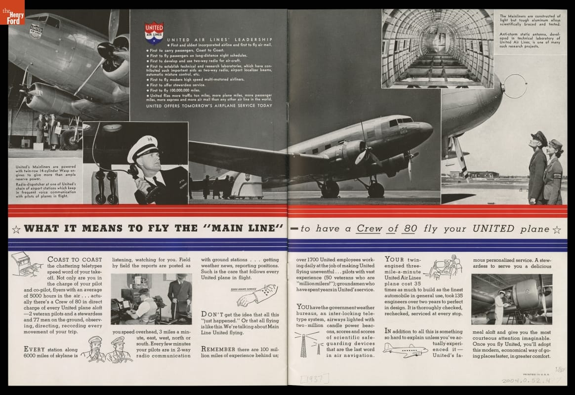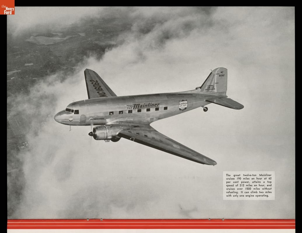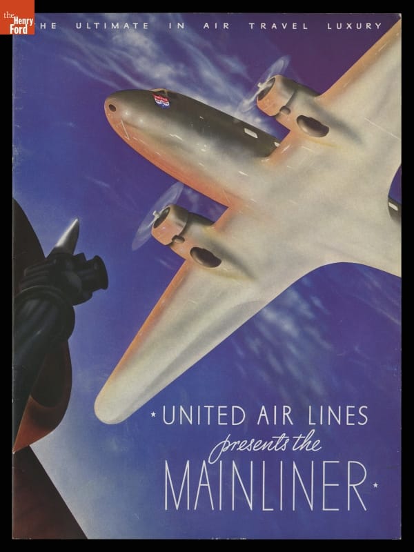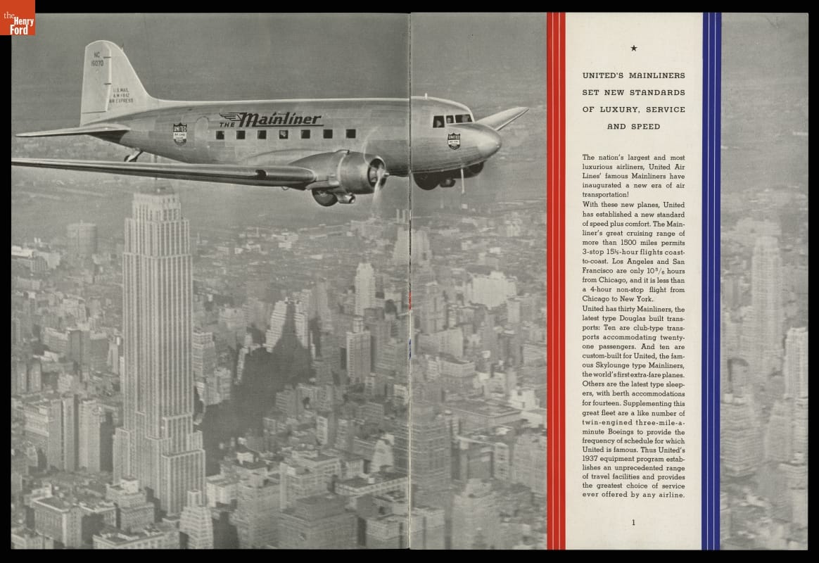 United Airlines promoted its new Douglas DC-3 "Mainliners" in this 1937 brochure. With a range of 1,500 miles, the Mainliners flew from New York to San Francisco in less than 16 hours with only three stops along the way. The planes came in three configurations: standard 21-passenger coaches, sleepers with folding berths for 14, and "Skylounges" with deluxe swiveling seats.