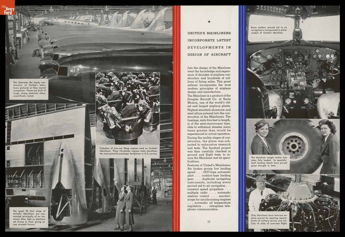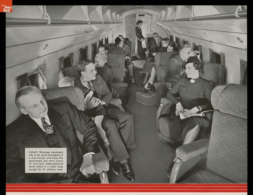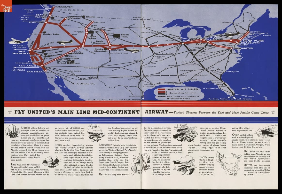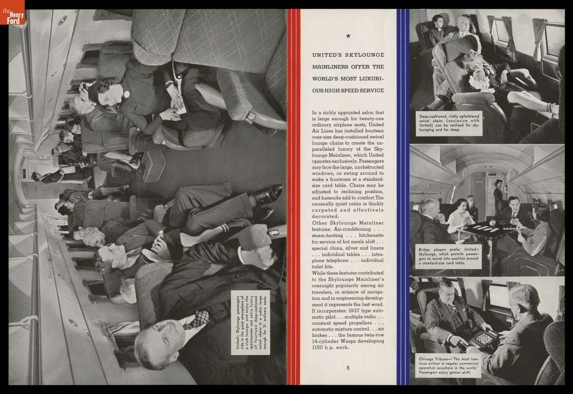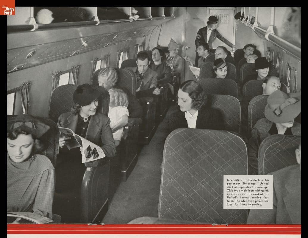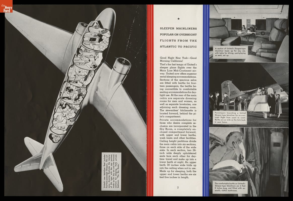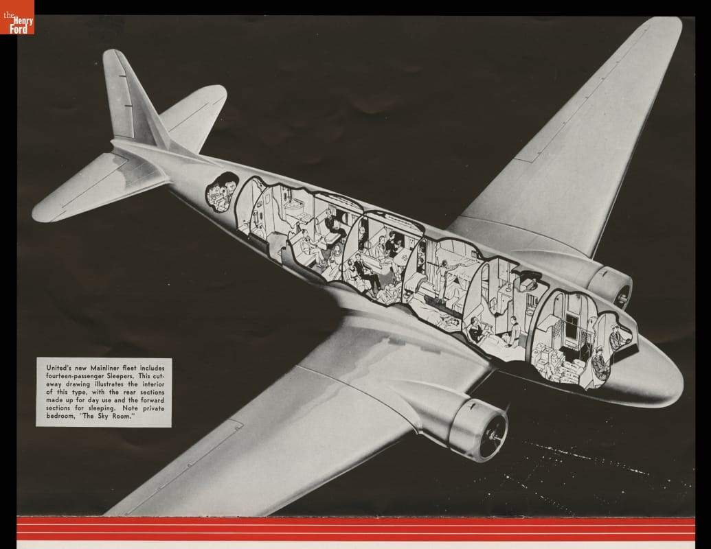 United Airlines promoted its new Douglas DC-3 "Mainliners" in this 1937 brochure. With a range of 1,500 miles, the Mainliners flew from New York to San Francisco in less than 16 hours with only three stops along the way. The planes came in three configurations: standard 21-passenger coaches, sleepers with folding berths for 14, and "Skylounges" with deluxe swiveling seats.