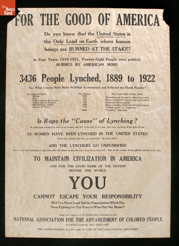 In 1912, the NAACP began a formal campaign to ban lynching. This 1923 broadside informed Americans about the numbers, causes and brutality of lynching. An anti-lynching bill was first introduced in Congress in 1918. A later version -- and others that followed -- failed to pass in the United States Senate. In June 2005, the Senate finally issued a formal apology for never having outlawed lynching.