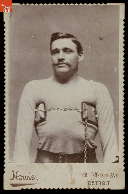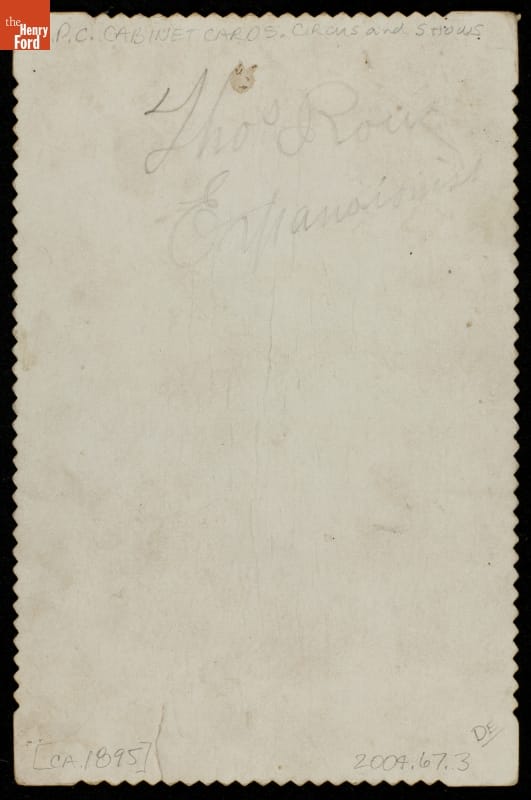 Professional photographers began producing cabinet cards in 1867. Consumers quickly preferred them over earlier cartes-de-visite, which were mounted on smaller cardboard stock. Through the early 1900s, Americans commonly exchanged and collected cabinet photographs of family, friends and celebrities. This example, made in Detroit, Michigan, around 1895, depicts Thomas Rowe, a sideshow performer in the Walter L. Main Circus.