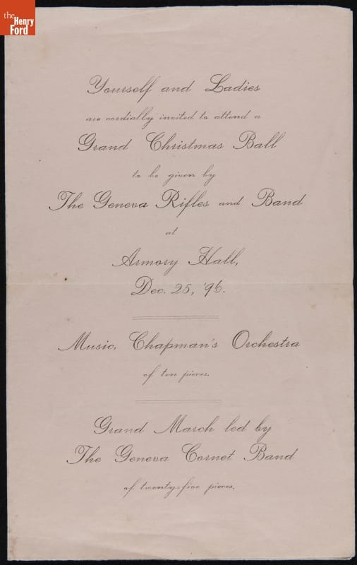 Yourself and Ladies are cordially invited to attend a Grand Christmas Ball to be given by The Geneva Rifles and Band at Armory Hall, Dec. 25 '96 [...]