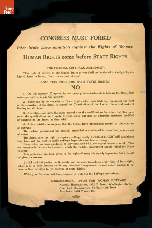 Should voting rights be decided by individual states or the federal government? In this broadside, the Congressional Union for Woman Suffrage (later the National Woman's Party) argued for women's voting rights as a national issue.