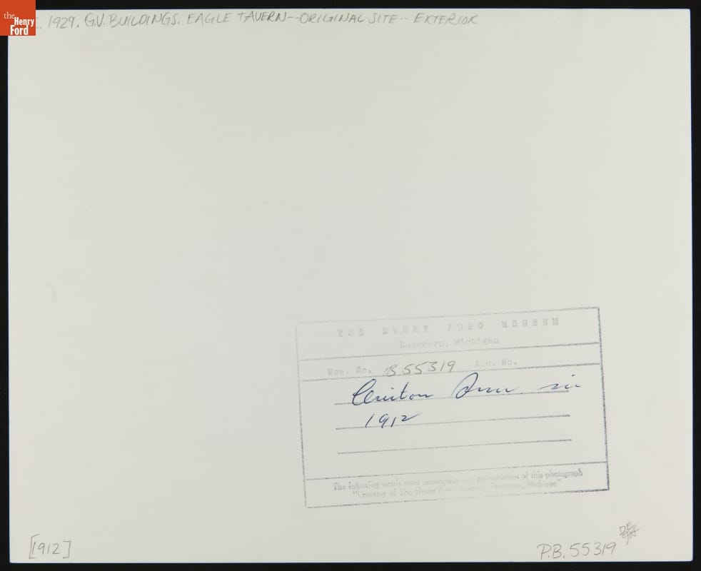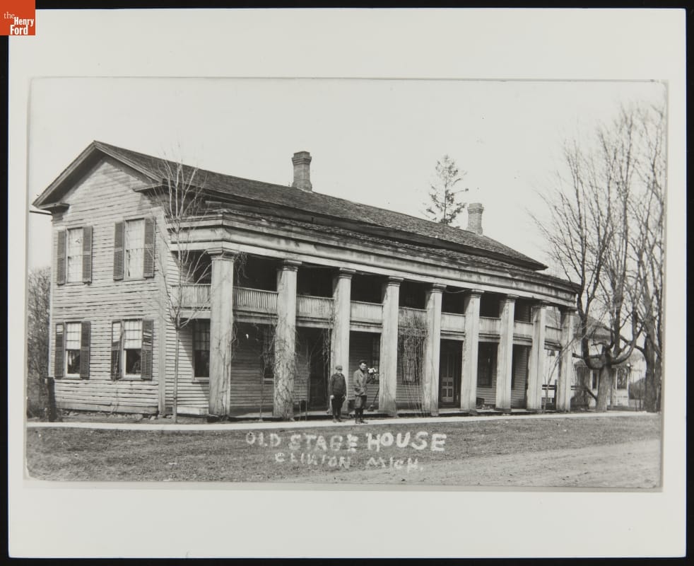 This "Old Stage House," constructed 1831-2 in Clinton, Michigan, was originally a stagecoach stop on the Detroit-to-Chicago road. In 1927, Henry Ford purchased the building from resident Ella Smith -- the daughter of Walter Smith, who had run the hostelry as Smith's Hotel between 1868 and 1896. Moved to Greenfield Village, the restored and renamed Clinton Inn opened in 1929.