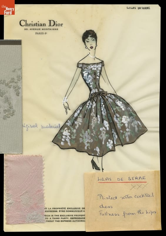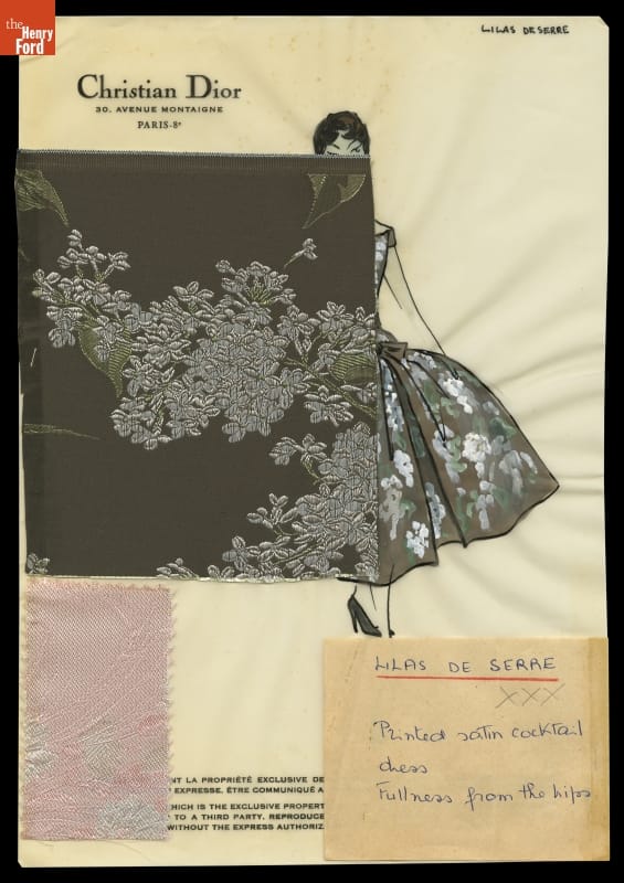 Christian Dior Fashion Design Drawing with Fabric Swatches, "Lilas de Serre," 1954