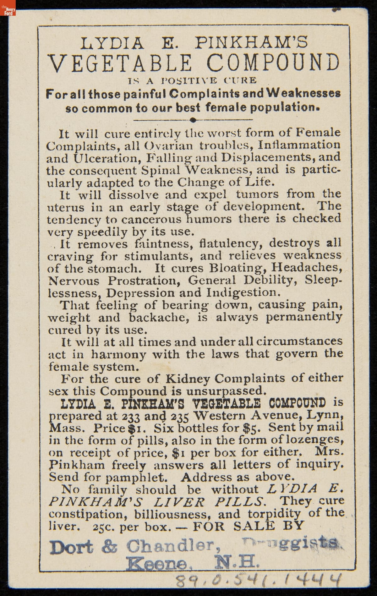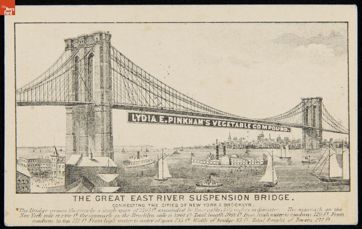 In 1873, Lydia E. Pinkham created "Pinkham's Vegetable Compound," a mixture of roots, herbs, and alcohol that she claimed would treat a variety of "female complaints." A few years later, Pinkham established a patent medicine company and began marketing and selling her product. Pinkham publicized the herbal remedy through pamphlets, magazine and newspaper advertisements, and small trade cards like this one.