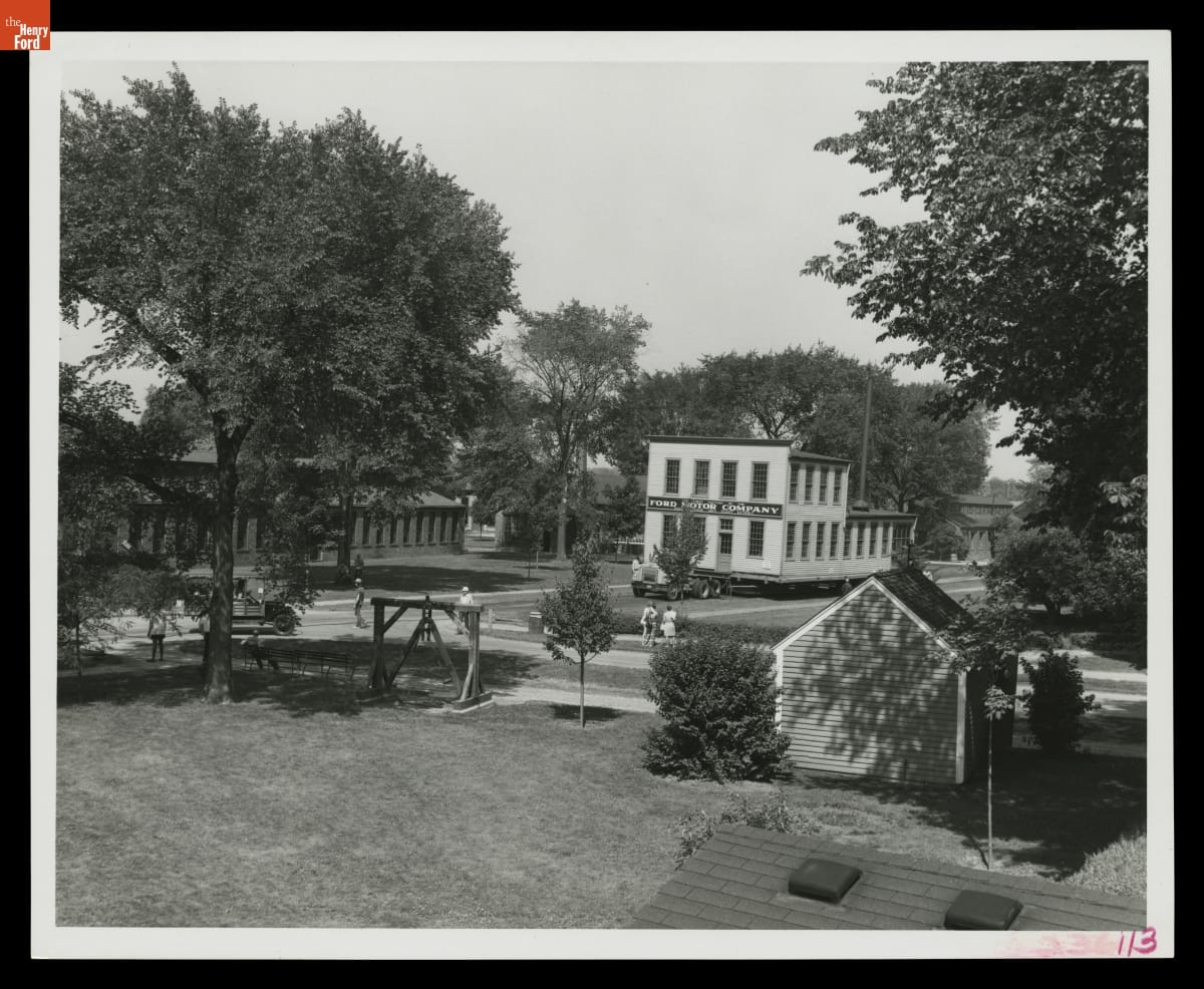 As exhibits and interpretation change, artifacts are moved -- sometimes even whole buildings. That was the case on June 28, 1974, when the replica Ford Mack Avenue Plant was relocated within Greenfield Village. The building was moved closer to the Ford Home and the Bagley Avenue Workshop. All three structures joined the "Henry Ford's Model T" district in 2003.