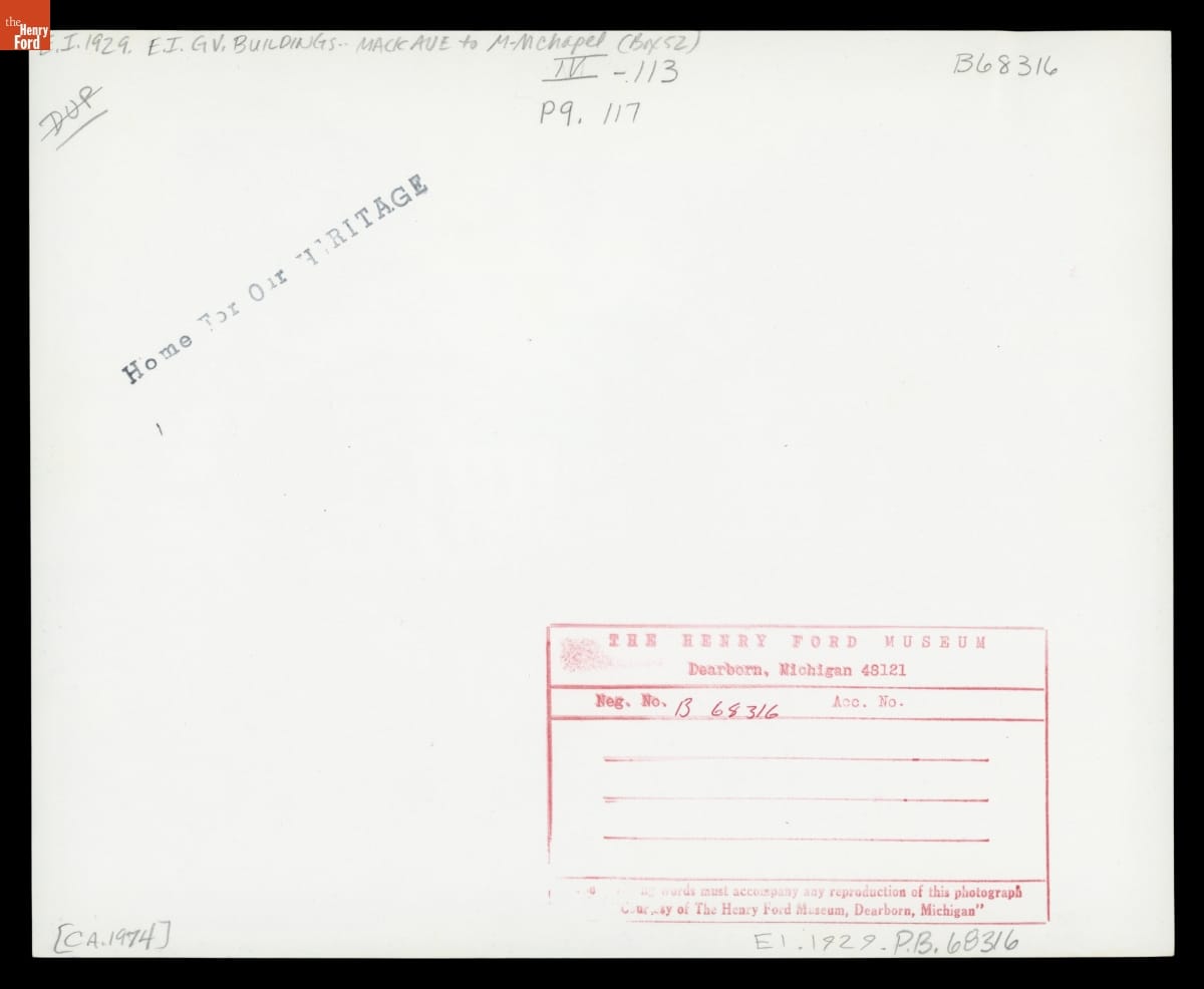 Ink stamps on verso: Home for the Heritage | Henry Ford Museum Neg. stamp Neg No. 68316