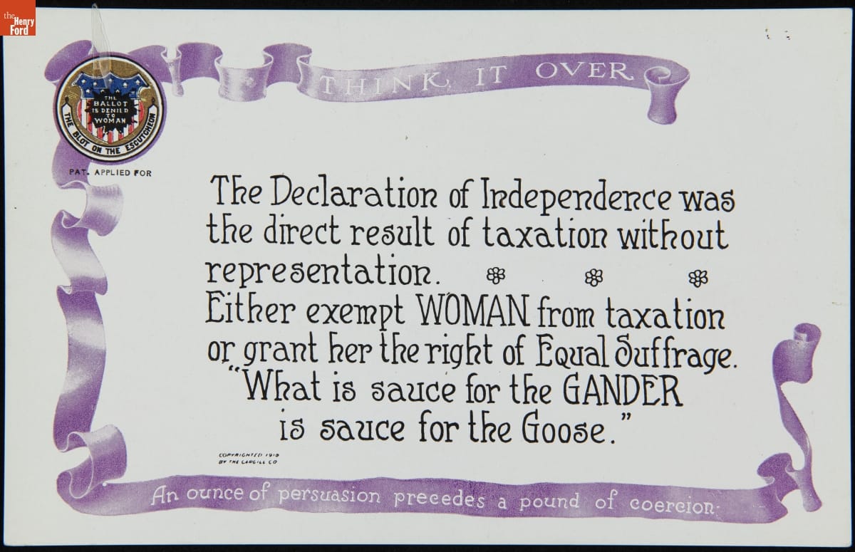The Declaration of Independence was / the direct result of taxation without / representation. / Either exempt WOMAN from taxation / or grant her the right of Equal Suffrage. / What is sauce for the Gander / is sauce for the Goose.