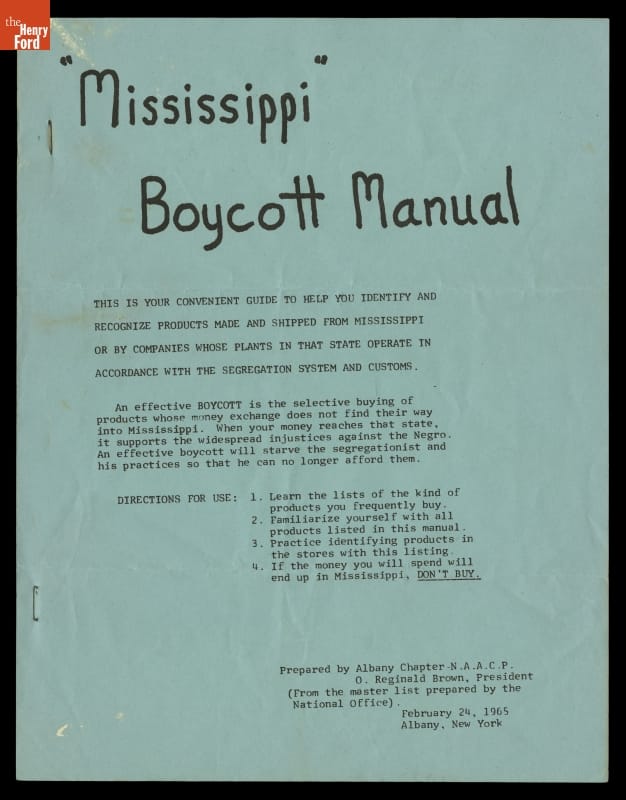 Allies of desegregation could support the civil rights movement by boycotting southern companies and products. In 1965, the Albany (New York) Chapter of the NAACP promoted a boycott of Mississippi goods. This manual listed the companies and products its members should avoid. It was hoped that the loss of customer dollars would help put an end to that state's segregationist policies.