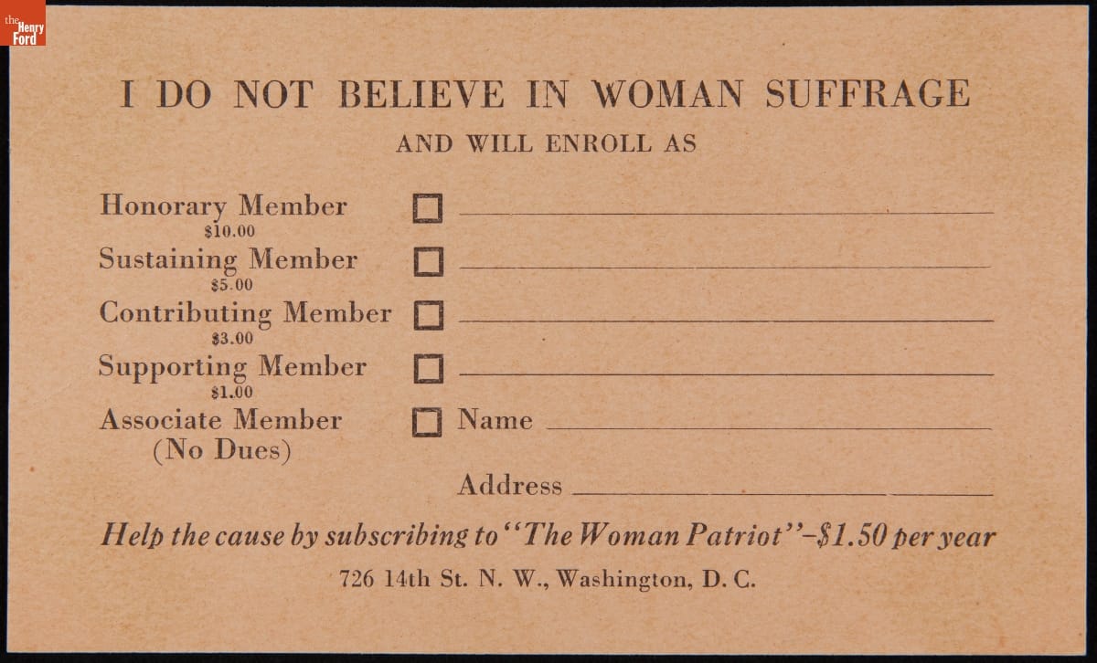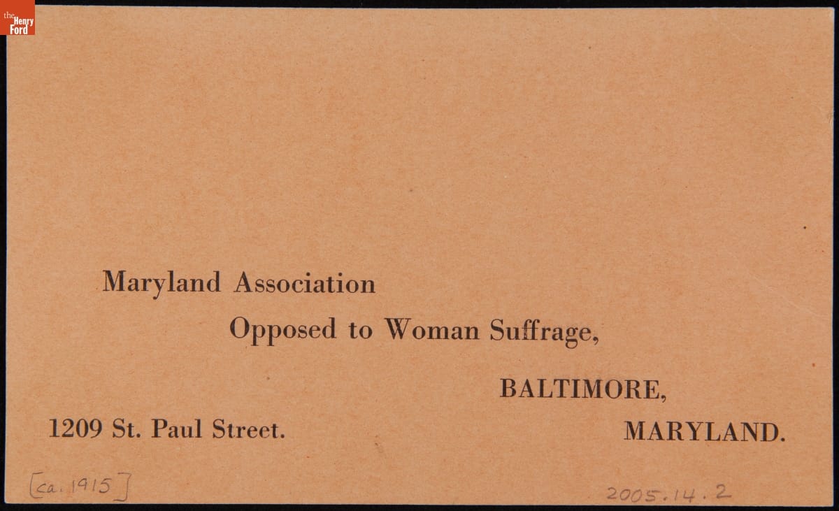 During the struggle for women's voting rights in the early 20th century, many men and some women strongly opposed the notion of women voting. These "anti-suffragists" argued that women were both physically and emotionally incapable of dealing with the strains of politics. This membership postcard for the Maryland Association Opposed to Woman Suffrage supported these assessments.