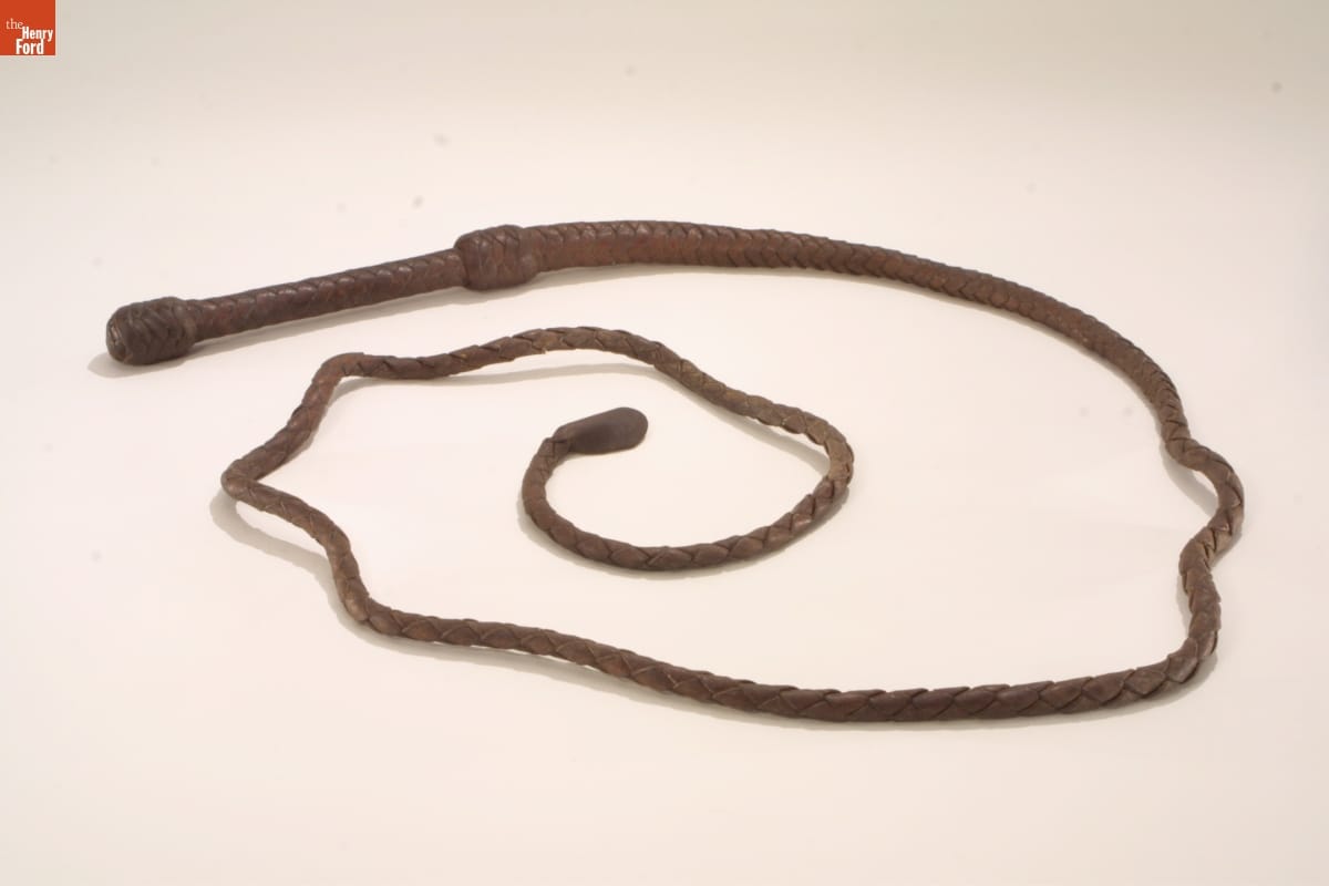 The wealth and power of Southern plantation owners depended upon a large labor force of enslaved people. They justified their actions by considering enslaved people to be mere pieces of property. This bullwhip was originally intended for cattle or stock, but also attests to the brutal treatment of enslaved African Americans.