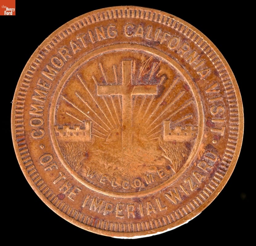 The Ku Klux Klan was reborn in the late 1910s and flourished but began to decline in the mid-1920s. It never completely disappeared, however. This token from about 1930 commemorates the visit of the Klan's Imperial Wizard to California. The innocuous phrases and symbols belie the hatred, vigilantism, and violence found under the hood of the Klan.