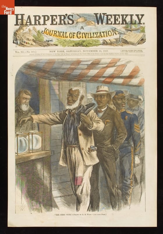 This 1867 issue of Harper's Weekly shows Black Americans lining up to cast their ballots. Congress had recently approved measures allowing African Americans the right to vote -- a right later ratified in the 15th Amendment. Southern states however worked to find ways to disenfranchise black voters; and by the end of the century had in large part succeeded.