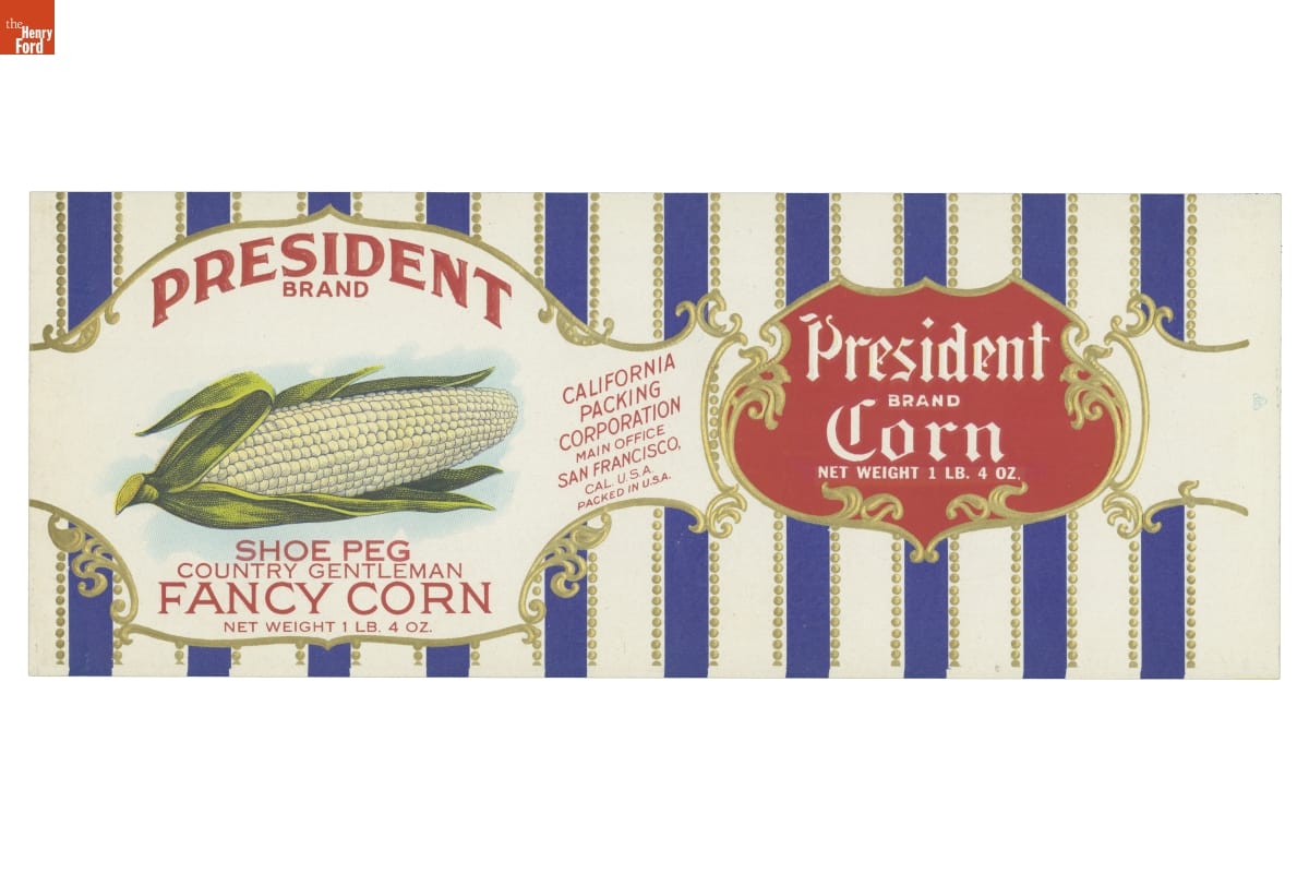 Manufacturers of similar products sought ways to make their company's goods stand out on store shelves. Attractive labels, like this elegant design for President Brand "Shoe Peg Country Gentleman Fancy Corn," helped catch the attention of potential customers--hopefully encouraging them to purchase the company's product rather than that of a competitor.