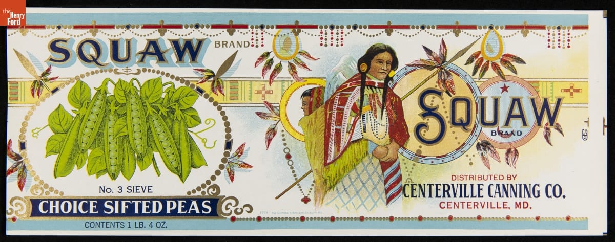Food companies in the early 1900s used colorful, eye-catching labels to attract potential customers. This label depicts a Native American woman--a romanticized image used to appeal to non-Native shoppers. Though the brand name has roots in the Algonquin language, the word's appropriation and misuse by non-Native speaking Americans over the years have twisted the name into a term used to disparage Indigenous women.