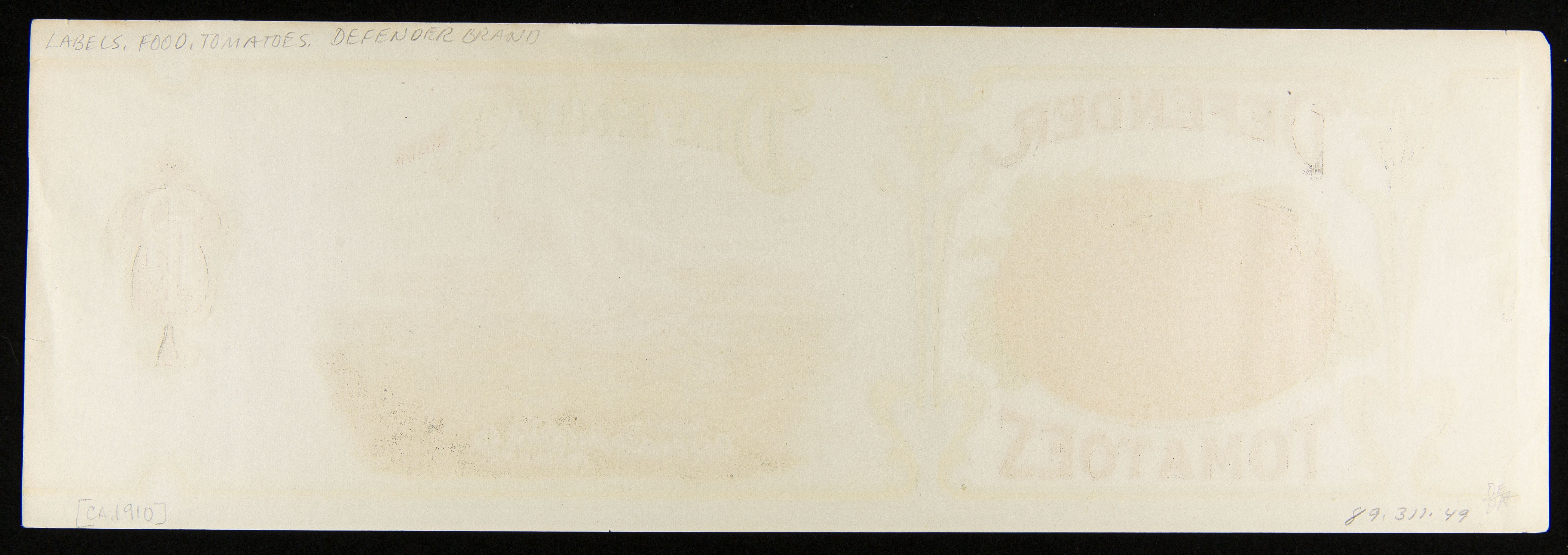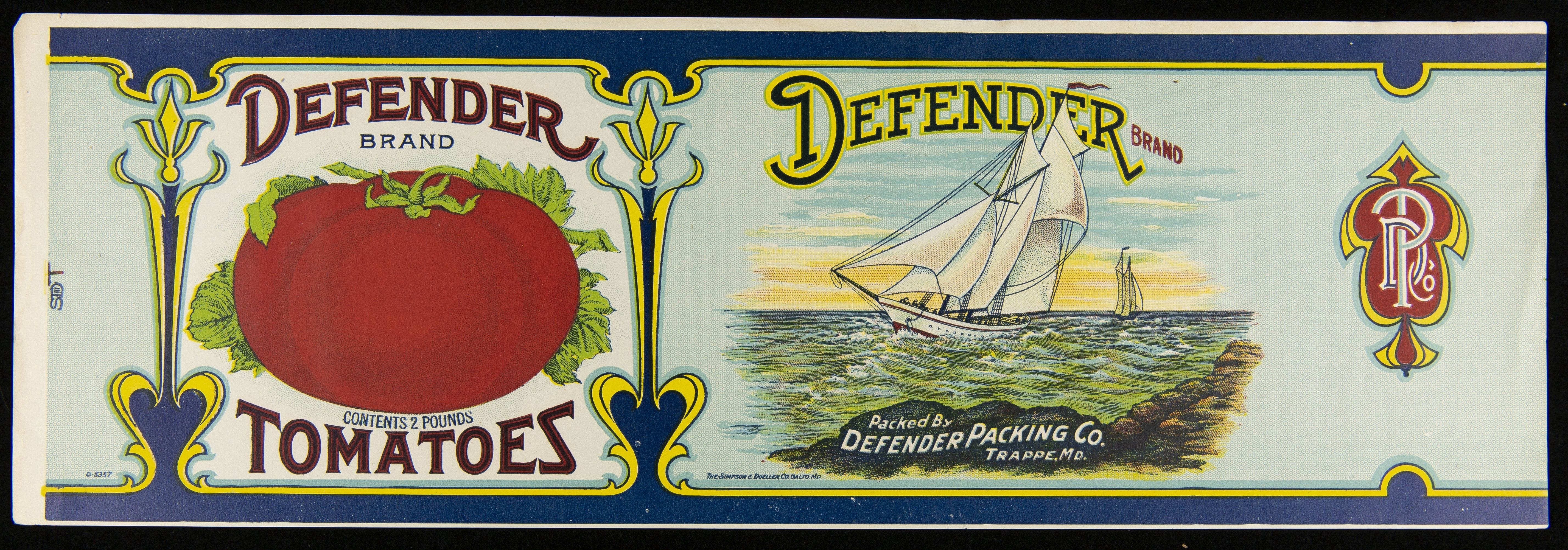 Labels of the late 19th to early-20th-centuries were colorful and eye-catching. Skilled lithographers created these labels for packing companies to attract customers' attention and encourage them to purchase their company's product over their competitors'. This label for Defender Brand Tomatoes was designed by Simpson and Doeller, a prominent lithograph company for can labels out of Baltimore, Maryland.