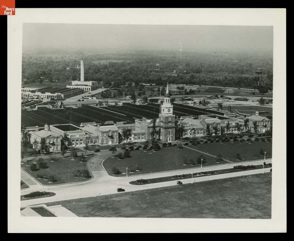 A series of dark roofs in this 1934 photograph reveals the sheer size and open plan of Henry Ford's Dearborn, Michigan, museum. Ford commissioned Detroit architect Robert O. Derrick to design his museum, which included multiple references to colonial buildings. The most prominent facade was Derrick's detailed replica of Independence Hall in Philadelphia, Pennsylvania.