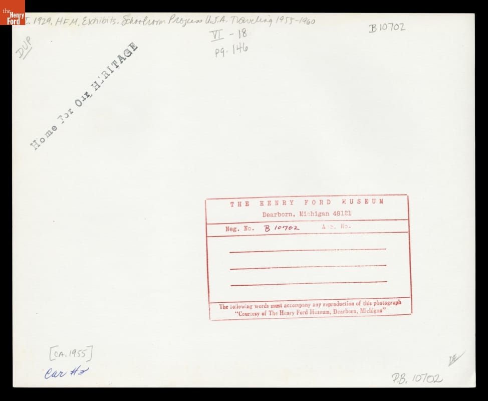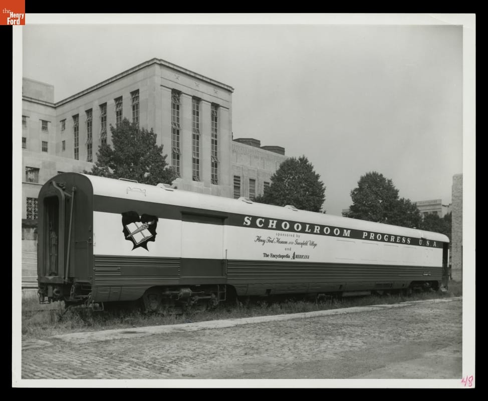 The Henry Ford produced Schoolroom Progress, U.S.A., a traveling exhibition housed in two railroad cars, in 1955-1956. The exhibit featured re-creations of American classrooms from different periods in history to that point. Schoolroom Progress, U.S.A. included artifacts from The Henry Ford's holdings, and it increased national recognition of the museum and its collections.
