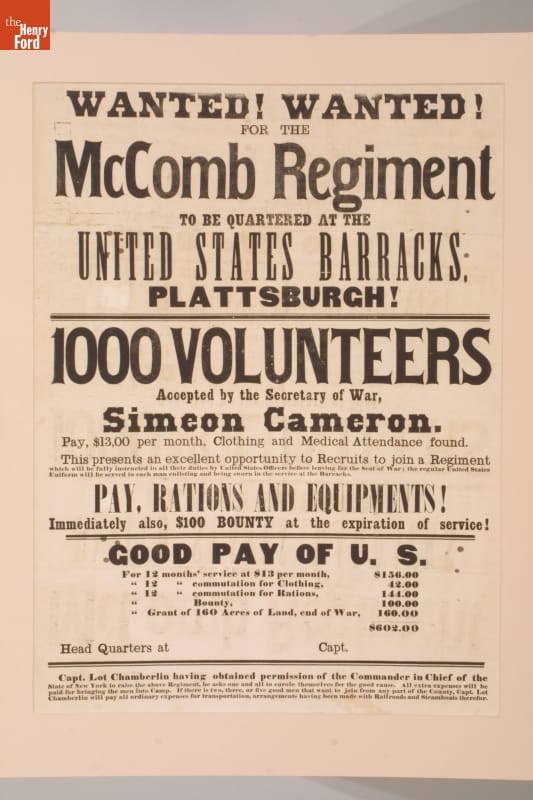At the outbreak of the Civil War, President Lincoln called for volunteers to help save the Union. This 1862 broadside rallied men from northern New York to join. McComb's Plattsburg Regiment became the 96th New York Infantry Regiment. These soldiers served in Virginia and North Carolina for most of the war and were part of the troops to occupy Richmond, Virginia, in 1865.
