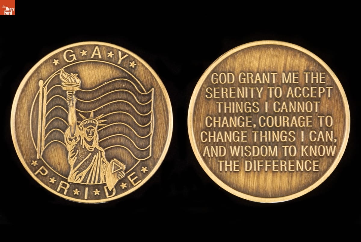 This mass-marketed "affirmation" medallion served as a tangible reminder of identity, patriotism, and faith for those struggling to gain support despite their gender identity, and protection under the U.S. Constitution. It included two iconic images, the Statue of Liberty and the Gay Pride flag designed by Gilbert Baker in 1978, with the serenity prayer written by Reinhold Niebuhr, American theologian, ethicist, and professor.