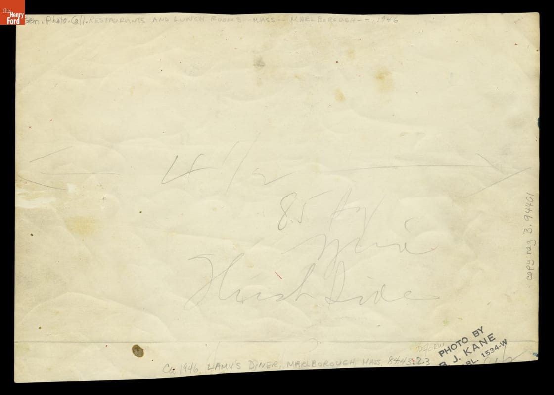 This photograph shows Lamy's Diner on its original site in Marlborough, Massachusetts, about 1946. The diner moved three times: first to Framingham, Massachusetts; next to Hudson, Massachusetts, in 1949; and finally to Henry Ford Museum in 1984.