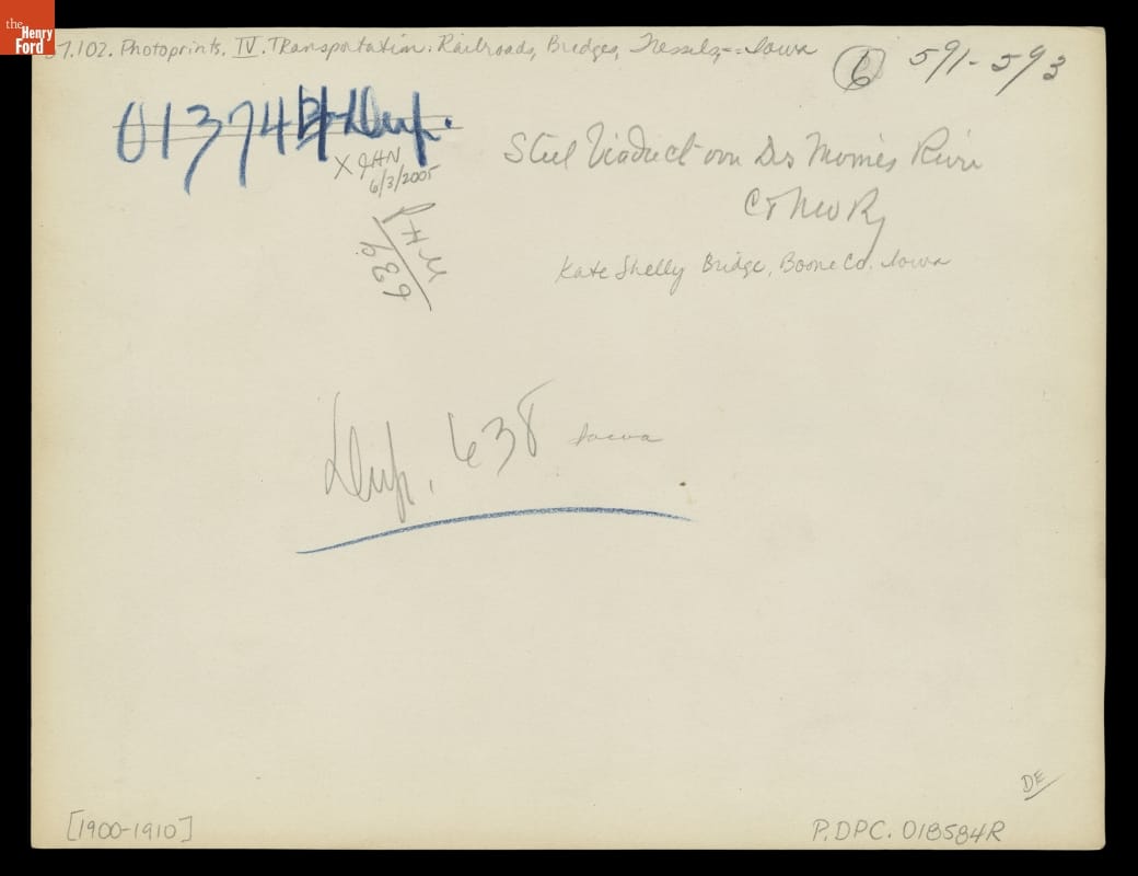 In pencil: Steel viaduct on Des Moines River C& NW Ry. (added 6/3/05: Kate Shelly Bridge, Boone Co. Iowa) / Dup 638 (incorrect) / WHJ 639