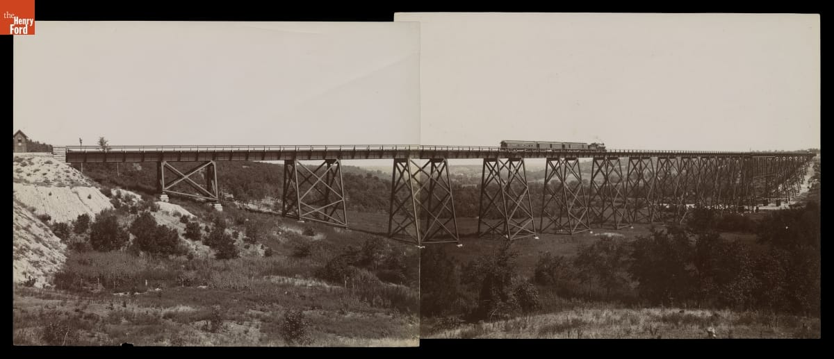 A Chicago & North Western Railway passenger train crossed the new Kate Shelley High Bridge near Boone, Iowa, in 1901. The viaduct's name honored a heroic teenage girl. During an 1881 thunderstorm, an earlier bridge at the site was damaged by a flood. Kate Shelley walked more than two miles through the storm to warn an approaching passenger train of the danger.