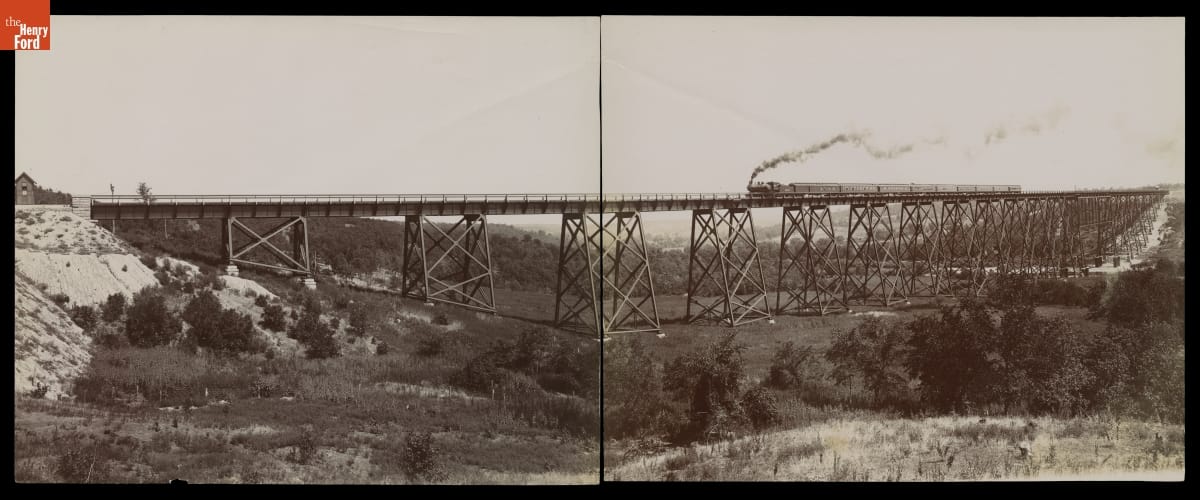 A Chicago & North Western Railway passenger train crossed the new Kate Shelley High Bridge near Boone, Iowa, in 1901. The viaduct's name honored a heroic teenage girl. During an 1881 thunderstorm, an earlier bridge at the site was damaged by a flood. Kate Shelley walked more than two miles through the storm to warn an approaching passenger train of the danger.