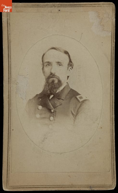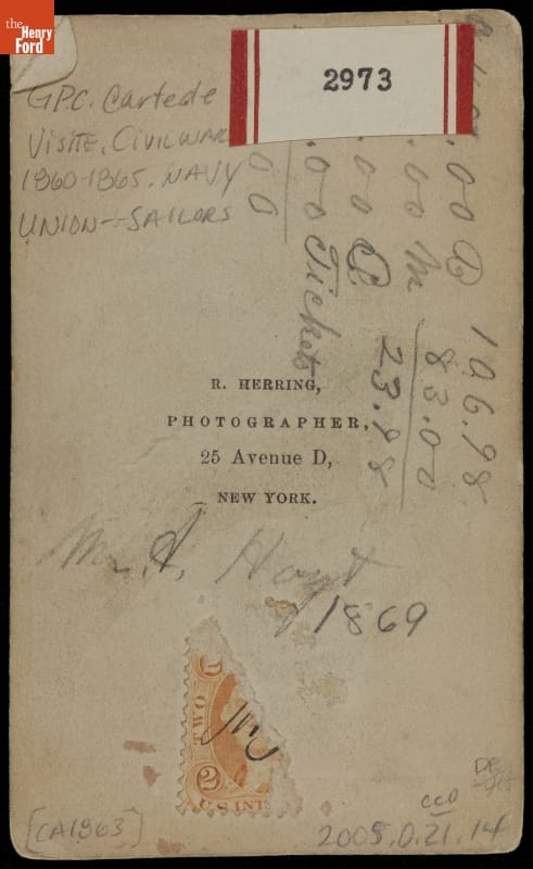 This carte-de-visite made by R. Herring, New York, shows an unknown Union Navy officer. Carte-de-visite was a small photographic print on cardboard stock made by professional photographers. Popular in the United States during the Civil War, soldiers and sailors often sent these inexpensive images back home as a reminder to friends and family members of their loved ones in service.