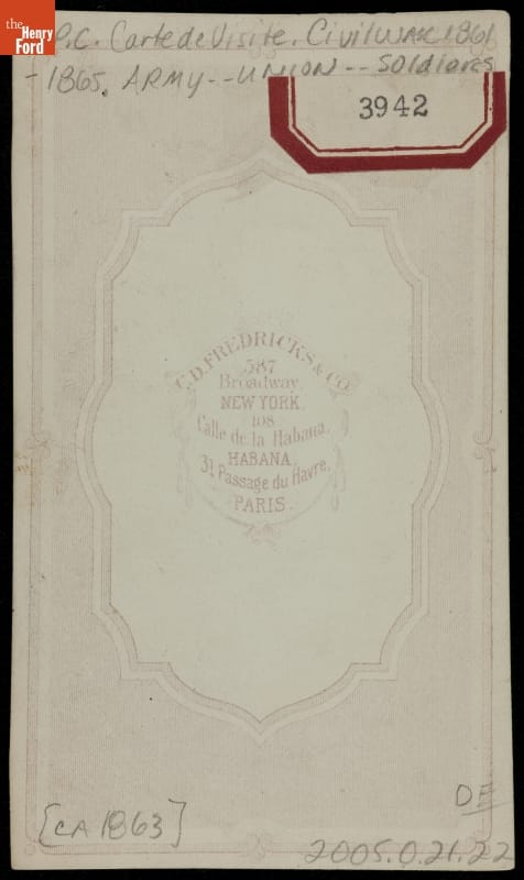 C.D. Fredricks & Co. of New York City made this half-length seated portrait of an unidentified Union Army officer. Professional photographers made cartes-de-visite beginning in the 1860s. Mounted on small cardboard stock, these early photographic prints proved popular in the United States from the Civil War through the 1880s. Americans exchanged and collected CdVs to help them remember family and celebrities.