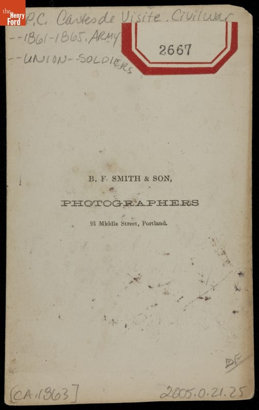 This carte-de-visite made by B. F. Smith and Son, Portland, Maine, shows an unknown Union Army officer. Carte-de-visite was a small photographic print on cardboard stock made by professional photographers. Popular in the United States during the Civil War, soldiers often sent these inexpensive images back home as a reminder to friends and family members of their loved ones in service.