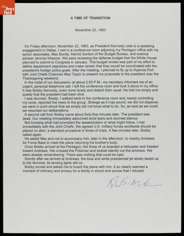 This memo was written by Robert McNamara, Secretary of Defense in the Kennedy administration, just after he learned of the death of President John F. Kennedy on November 22, 1963. He describes, in very personal terms, his reaction to the news from the President's brother, Robert Kennedy, that the president had been shot.