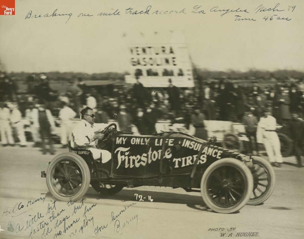 This photograph depicts racing legend Barney Oldfield driving a Christie to a 1909 track record in Los Angeles, California. Oldfield autographed this photo for Henry Ford who was instrumental in starting Oldfield's racing career.