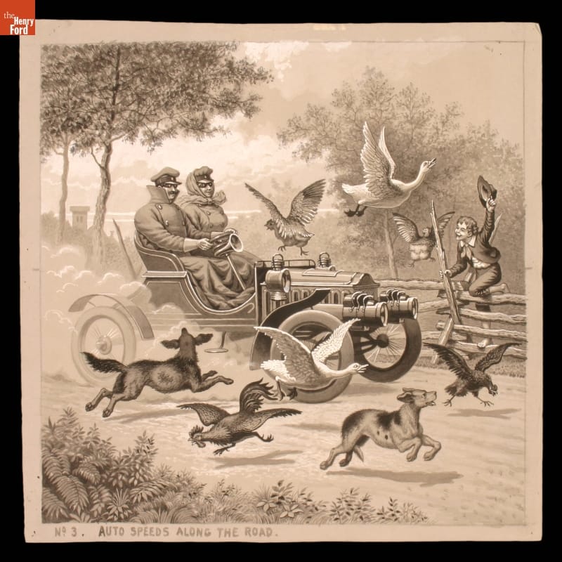 Before movies, Americans delighted in "Magic Lantern" slide shows. Artist Joseph Boggs Beale drew eight images for the 1906 slide series "Mr. Spurt and His Auto," lampooning the problems of early motoring. In this third slide, the Spurts speed along a country lane, exciting dogs, geese, roosters and a waving boy as they pass.