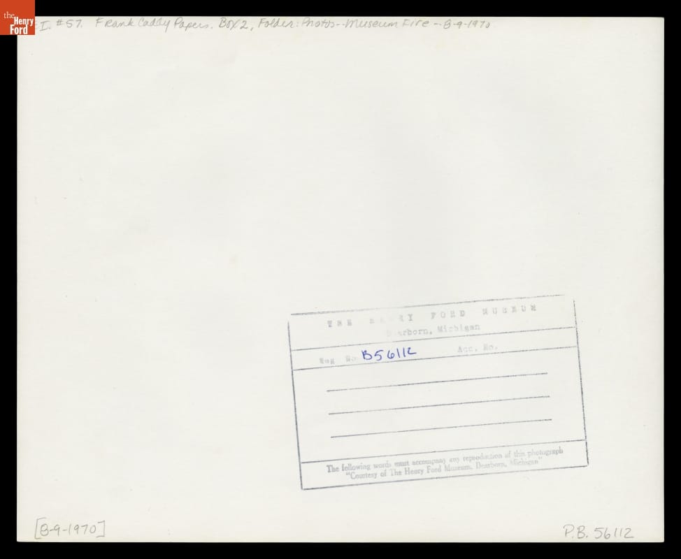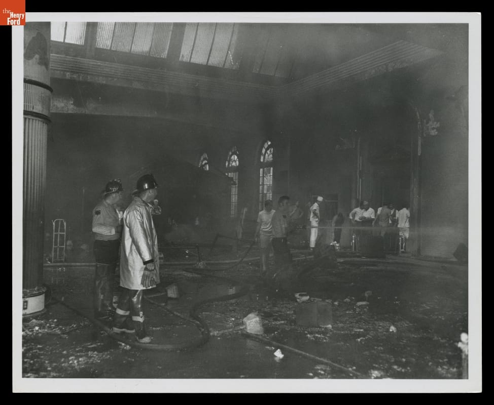 A fire broke out in the Henry Ford Museum on August 9, 1970. As soon as local firefighters had put out the blaze the museum staff began to assess the damage. Several exhibits and hundreds of artifacts were lost. Clean up started immediately and unaffected areas of the museum reopened two days later. Complete repairs took over a year.