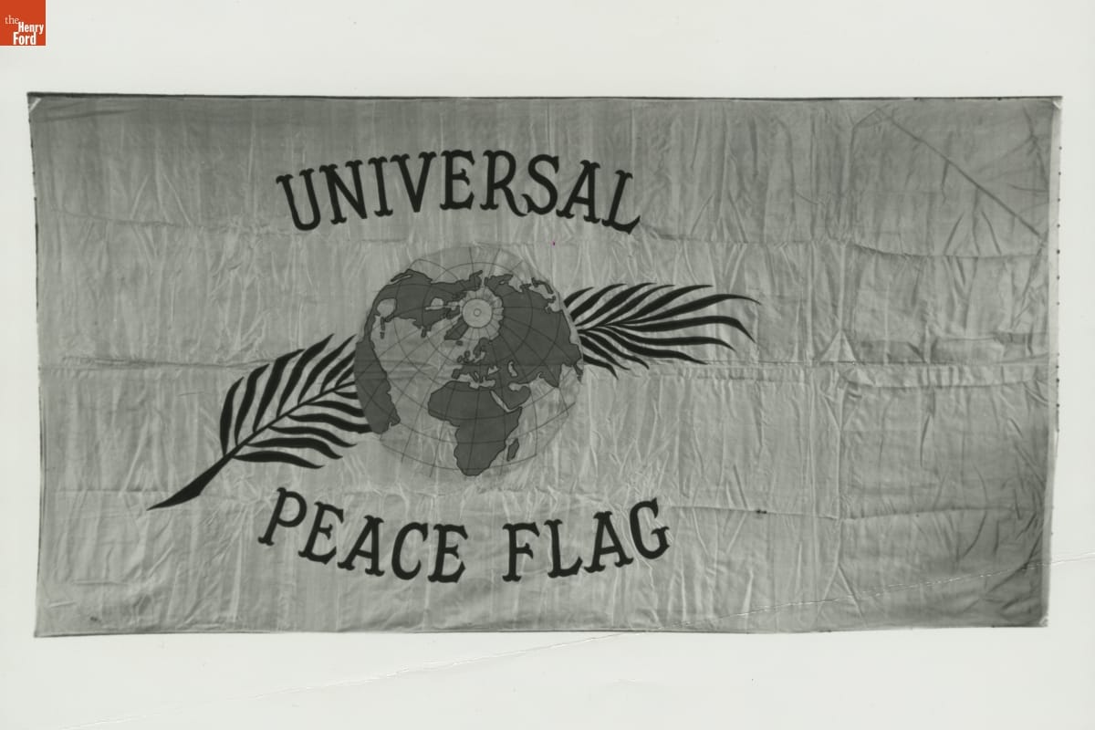 This flag was used on Henry Ford's "Peace Ship" expedition of 1915. Ford paid to sail more than 100 delegates and reporters to Europe in December 1915. His goal was to establish a conference of neutral nations that could end World War I. While the mission failed to bring peace, it brought extensive publicity to Ford and the pacifist cause.