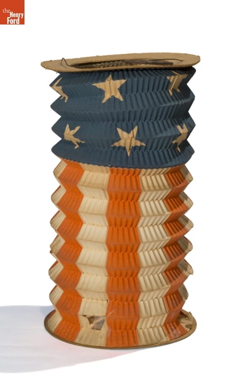 Late-nineteenth-century political parties rallied their supporters by holding torchlight parades. In the evening, marchers lit up the street carrying torches, lamps and lanterns. Inexpensive paper lanterns glowed with the image or name of the party's candidate or other patriotic imagery. This accordion-pleated lantern is decorated simply with stars and stripes.