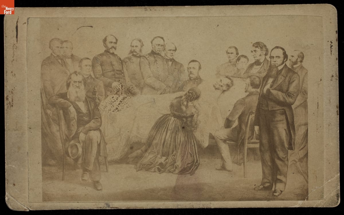 Abraham Lincoln's assassination in April 1865 plunged Americans into deep mourning. Prints and card photographs helped people to understand the tragic event. This collage has a drawing with photographic bust portraits added. It depicts a room of the Petersen House, where the president died, across the street from Ford's Theatre in Washington, D.C. Not all of these people were actually in the room the morning Lincoln died.