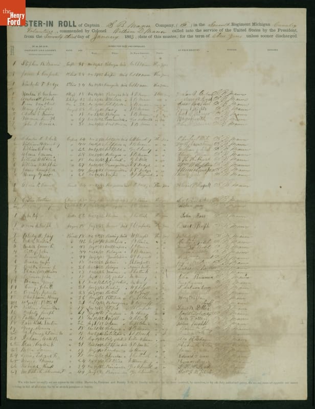 This "Muster-in Roll" from 1863 contains the names of soldiers and officers who enlisted in the 7th Volunteer Michigan Cavalry. This unit along with several other Cavalry units made up the Michigan Cavalry Brigade -- also known as the Wolverine Brigade. Michigan-born George A. Custer took command of the brigade a few days before the battle of Gettysburg.