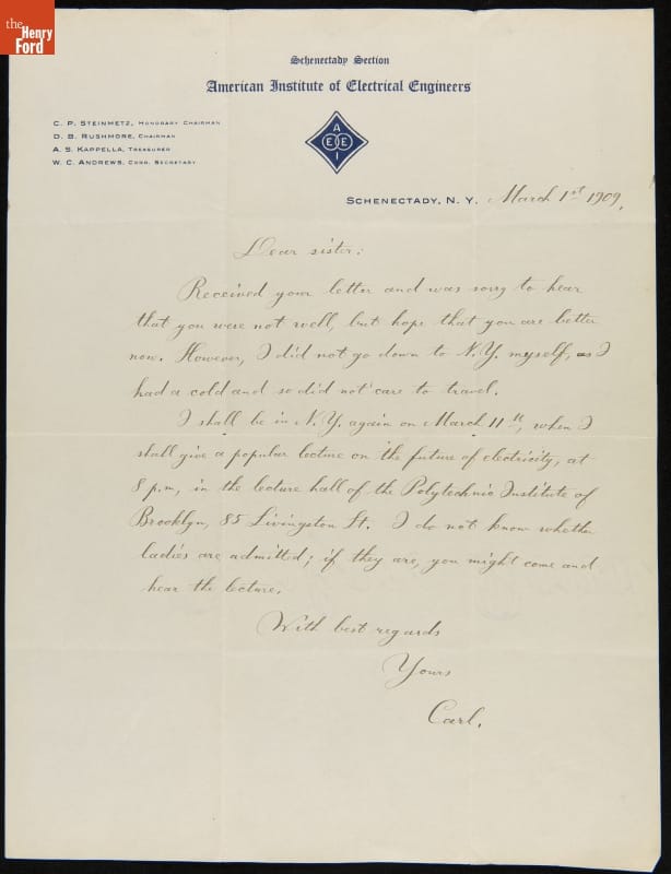 Letter from Charles P. Steinmetz to His Sister, Clara Steinmetz, March 1, 1909