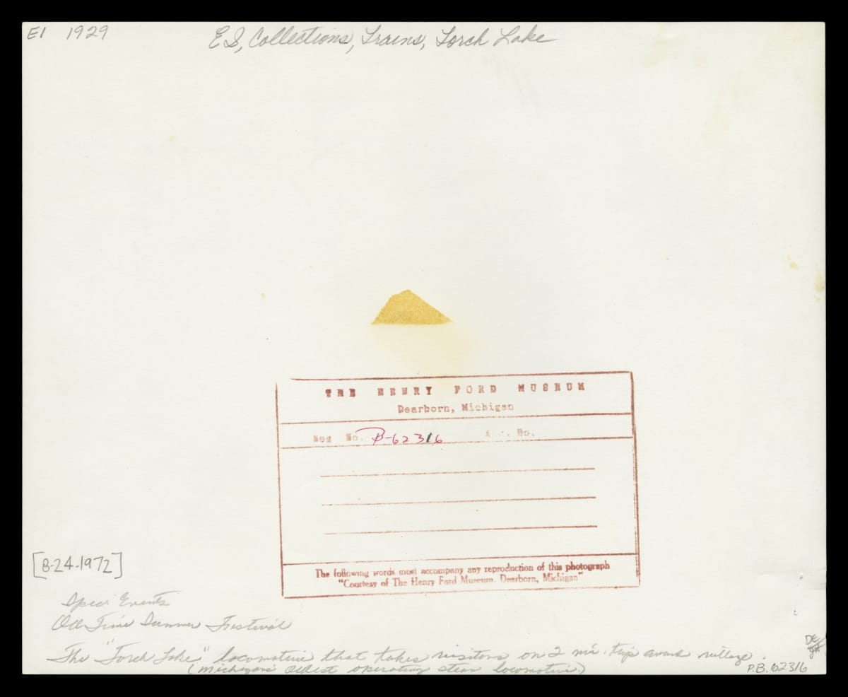 The Henry Ford's Weiser Railroad opened to the public in 1972. Its two-mile route took riders on a scenic loop around Greenfield Village. Authentic steam locomotives, maintained and operated by museum staff, pulled the open passenger cars. More than a simple excursion, the railroad's intermediate stations made it a practical transportation link around the village.