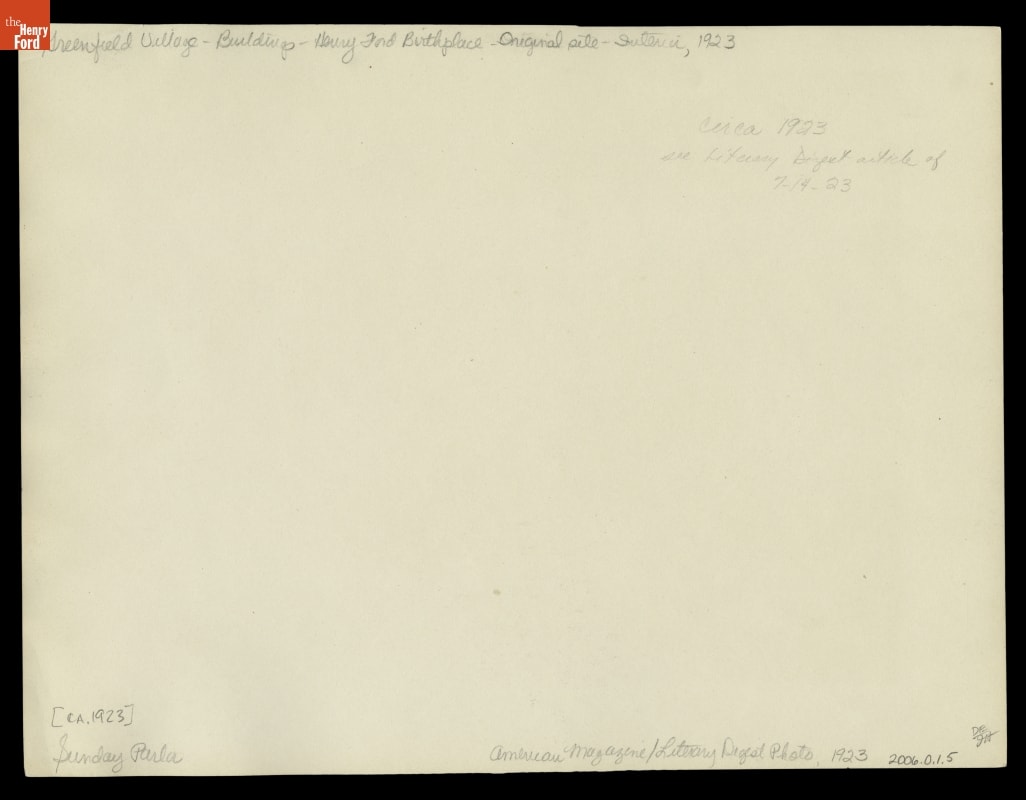 Henry Ford began restoration of his Dearborn, Michigan, birthplace in 1919. He repaired or replaced the farm buildings and filled the small, white clapboard house with original or similar furnishings he remembered from his boyhood. He dedicated the restoration to the memory of his beloved mother, Mary Litogot Ford, who died in 1876. In 1944, the house and outbuildings were moved to Greenfield Village.