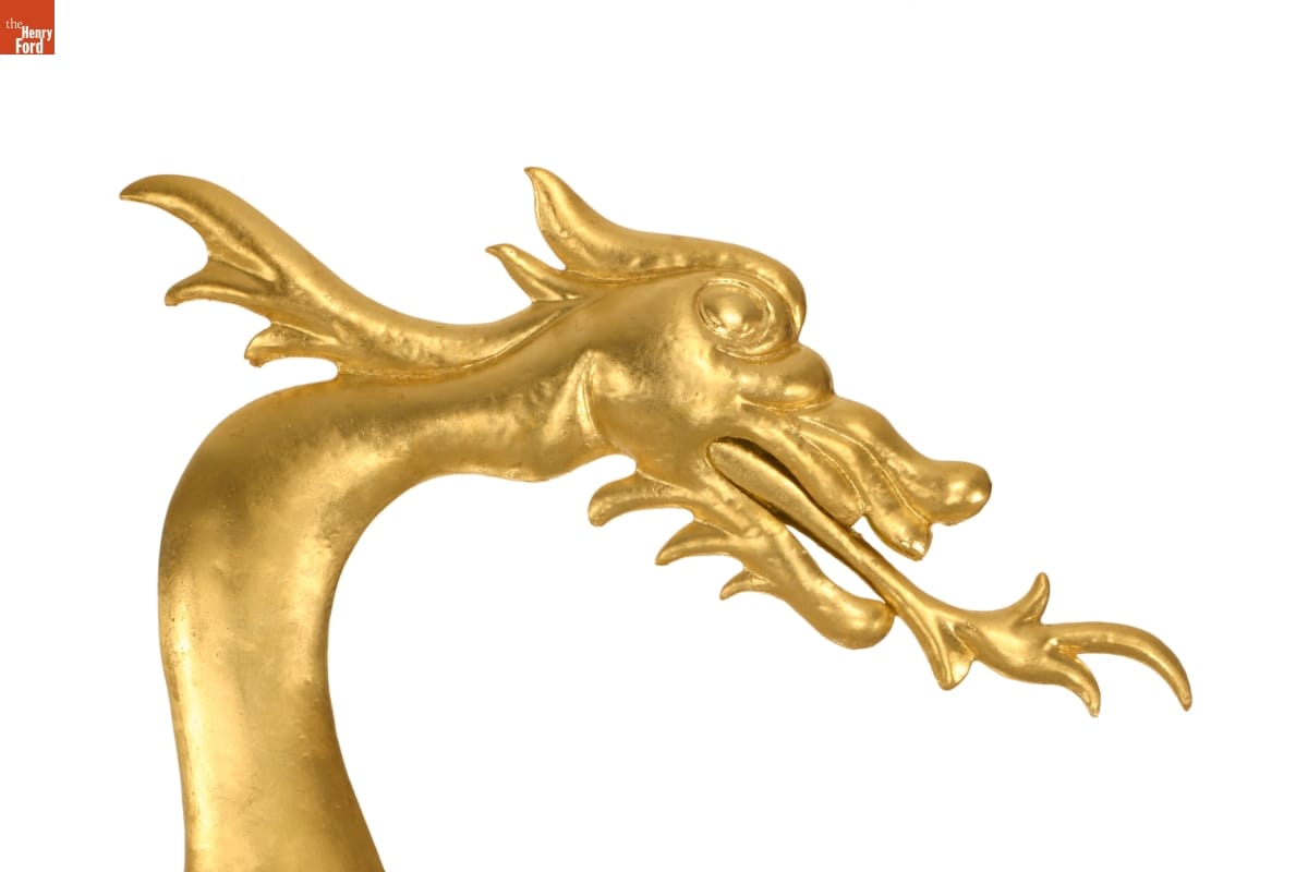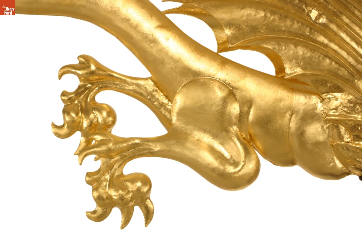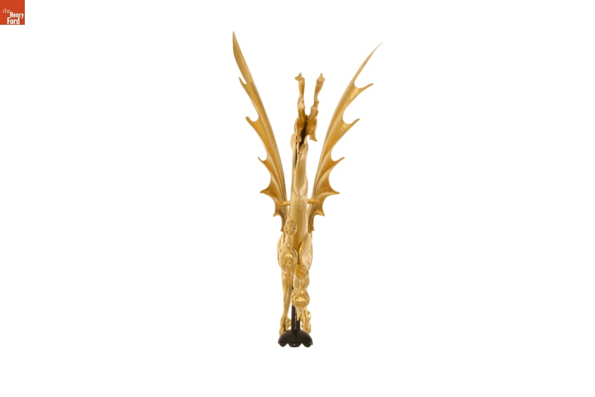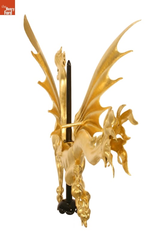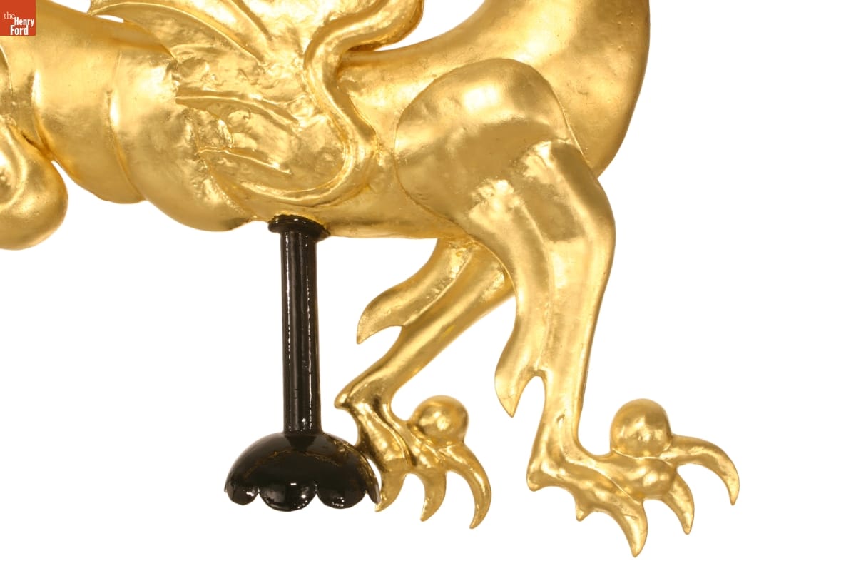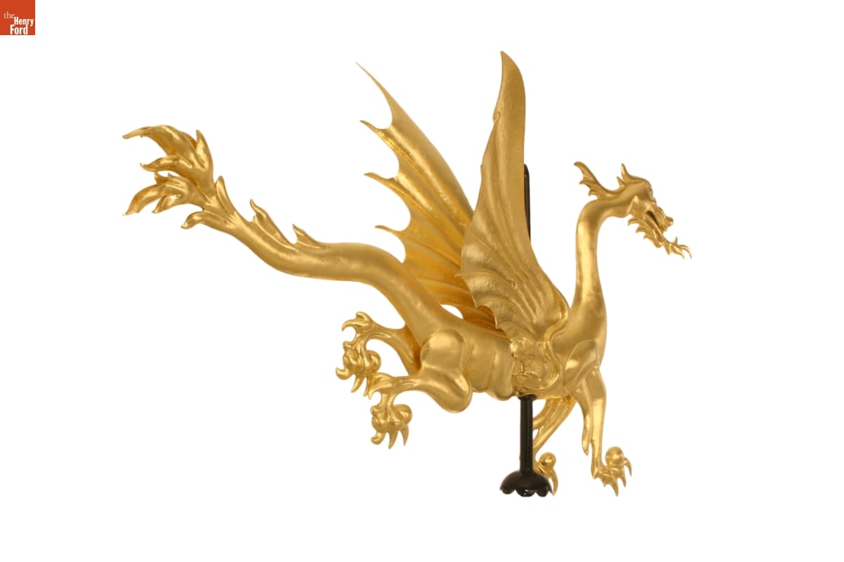 This dragon weathervane is one of the most vivid elements of Sir John Bennett's shop in Greenfield Village. Made of hammered copper in striking detail, it is a quiet masterpiece of design, craftsmanship, and balance. During restoration work in 2005, The Henry Ford staff made structural repairs and returned the dragon to its original splendor with a coat of gold leaf.