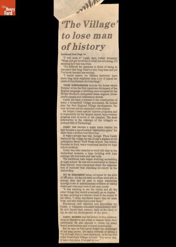 Frank Caddy first came to the Edison Institute museum -- today's The Henry Ford -- as a student at Henry Ford Trade School in 1932. He earned a degree at Detroit Business College and worked his way up through the museum's business offices. Caddy was appointed president of the Edison Institute in 1976 and held that title until his retirement in 1980.